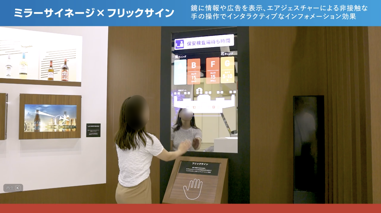 鏡に情報や広告を表示、エアジェスチャーによる非接触な手の操作で、インタラクティブなインフォメーション効果を提供する。