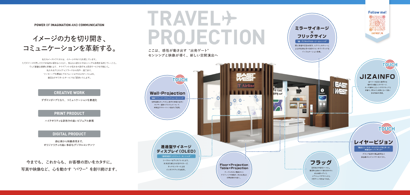 三つ折りパンフレットでは、ブース内で体験できる各種映像技術やコンセプトを、空港案内のような整理された情報設計で構成。